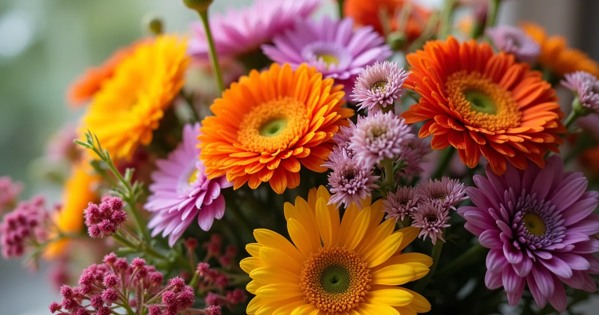 Arranjo desconstruído com flores da estação em tons vibrantes e variados, como crisântemos e gérberas, em um vaso de vidro colorido e irregular.