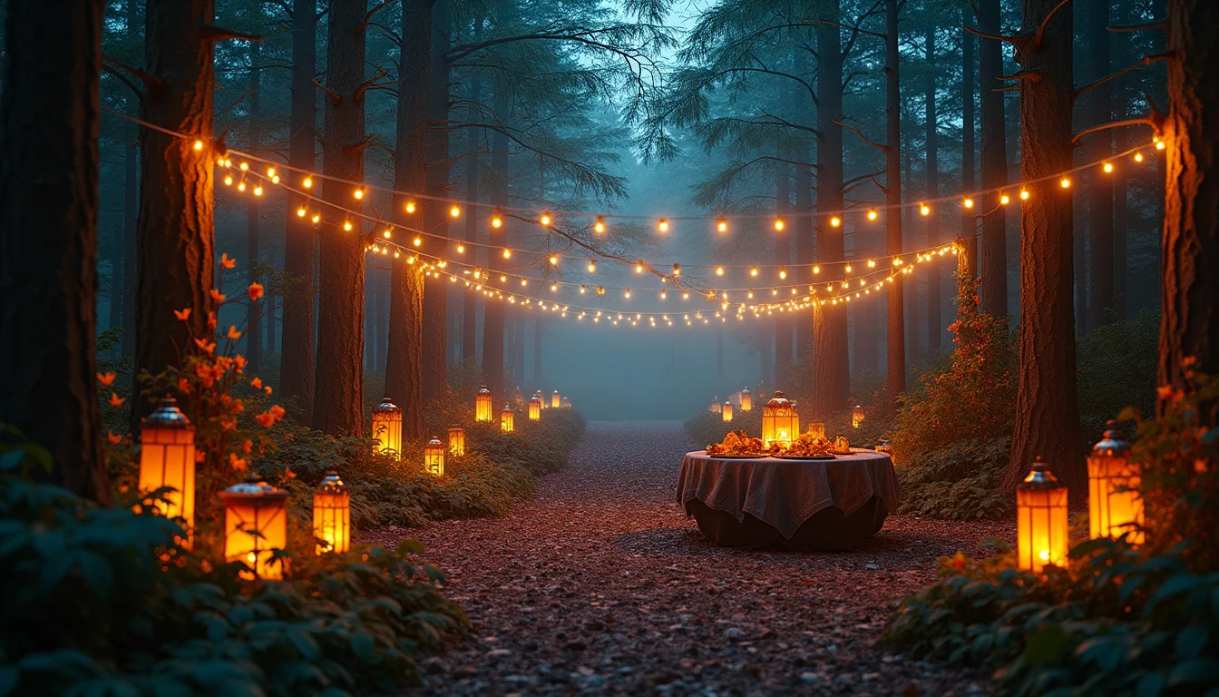 - Iluminação Mágica: Use luzes de fada, pisca-piscas em tons de âmbar e lanternas para criar o clima de floresta noturna. Velas de LED são ótimas para a segurança e o efeito.
