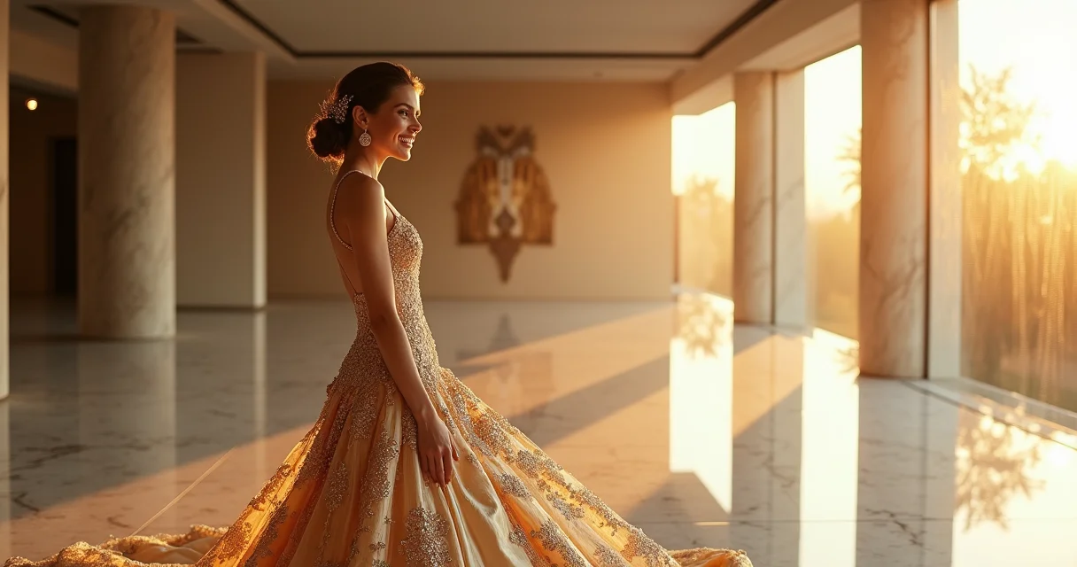 “Um vestido dourado em um casamento luxuoso não é apenas uma peça de roupa; é a materialização de um sonho, um símbolo de um novo começo com todo o esplendor que a vida pode oferecer.”