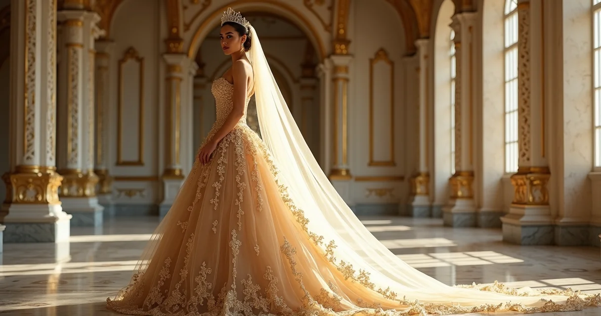 Olha só o detalhe: enquanto um vestido branco tradicional custa em média R$ 3.000 a R$ 8.000 no Brasil, um modelo com detalhes dourados em estilo realeza parte de R$ 6.000 e pode chegar a R$ 25.000, justamente pelo trabalho manual e materiais nobres.