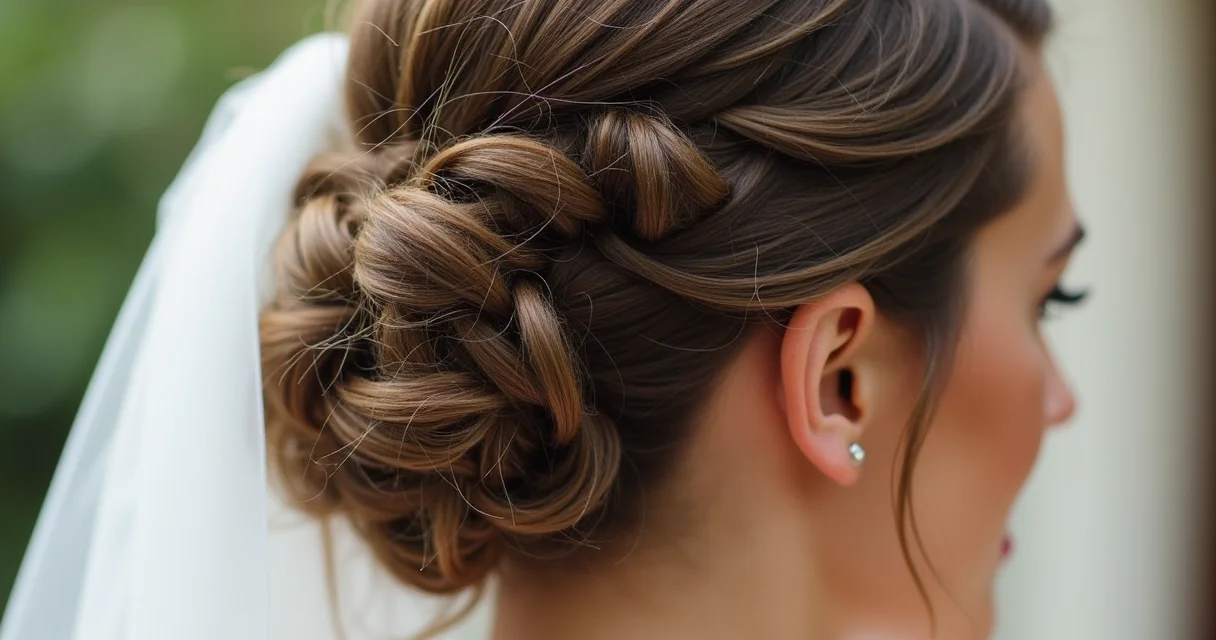 Coque baixo com trança embutida ao redor, em cabelo castanho médio com brilho acetinado, sob luzes direcionadas.