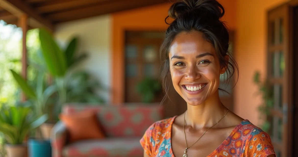 Sorriso no rosto refletindo a confiança do look pronto.