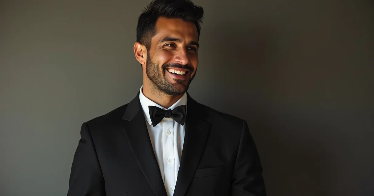 Para um casamento mais formal, o smoking preto (Black-tie) é a escolha mais elegante e tradicional. Considerado o traje máximo para eventos de gala, ele se diferencia pelas lapelas em cetim e pelo corte mais clássico. Se você optar por um smoking, pode até coordenar com seus padrinhos usando ternos pretos, criando um contraste elegante e destacando sua posição de honra.