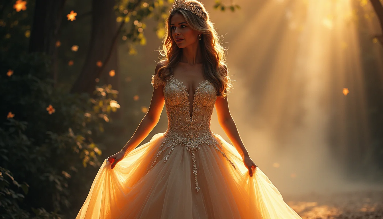 • Busque inspiração em detalhes: Além do vestido amarelo dourado, pense em elementos como a rosa encantada. Bordados discretos ou aplicações em renda que remetem a rosas podem trazer esse toque mágico.